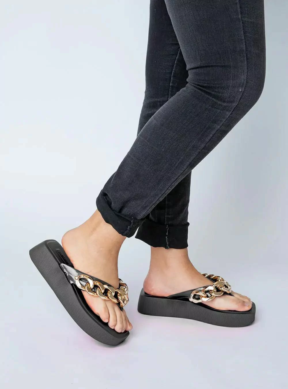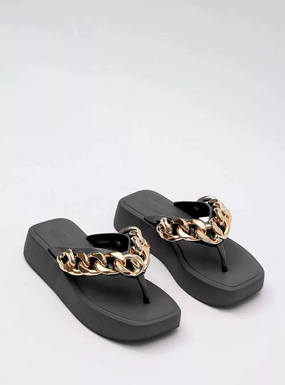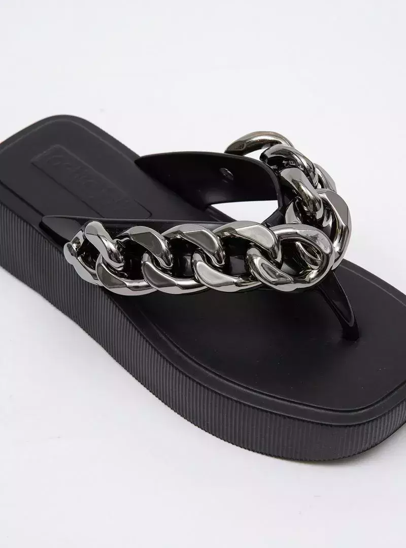 Chinelo de dedo na cor preto com solado flatform de EVA e bico quadrado. Possui aplicação de correntes metalizadas, com tiras grossas em J-Lastic, que separam os dedos. Palmilha da mesma cor com o nome da marca e solado flatform. Deixa dedos, laterais e calcanhar à mostra.